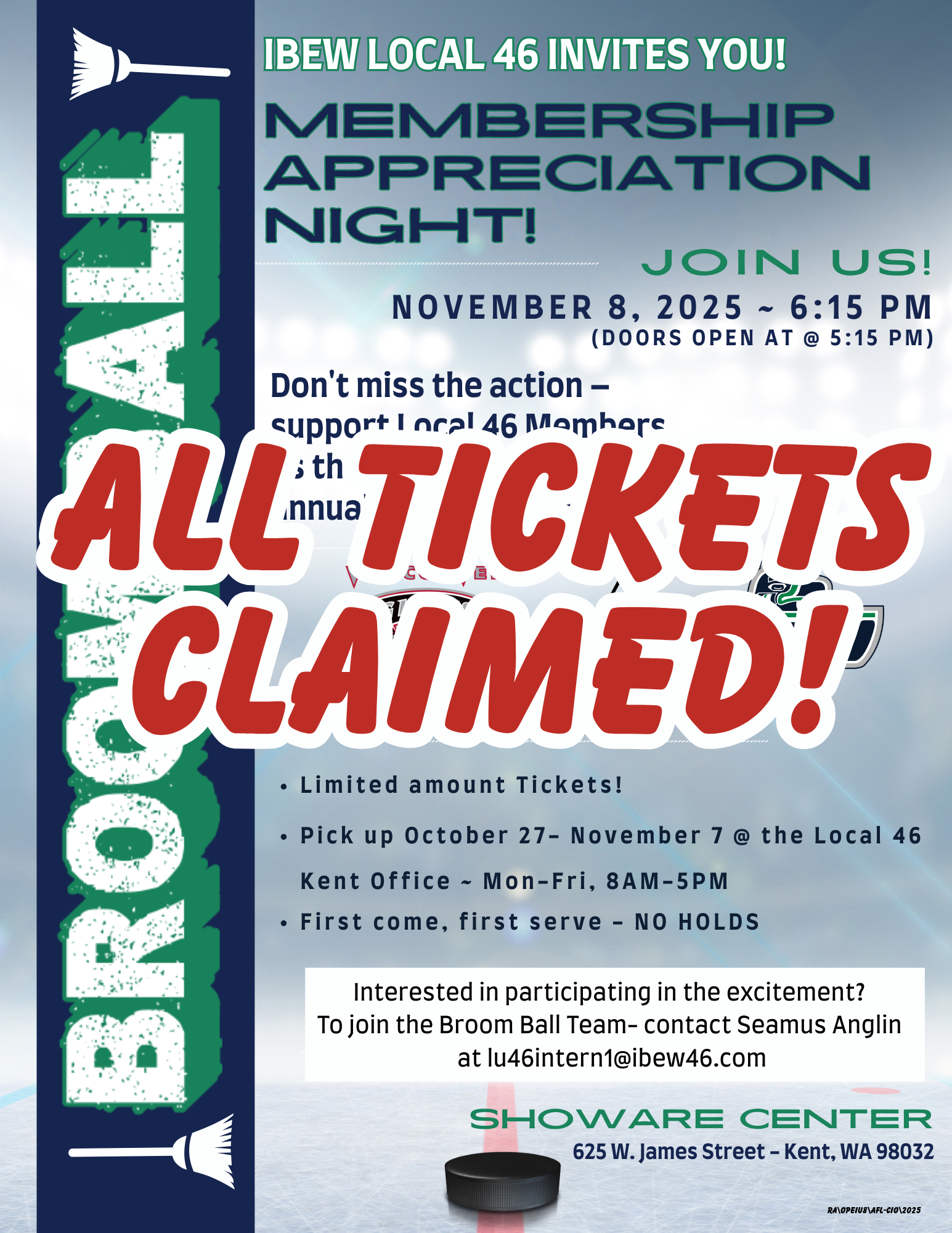 The IBEW Local 46 Women’s Committee is a place to socialize, strategize, and support the success of women within all units of Local 46 and with other unions and the community. We meet on the 4th Tuesday of every month at 5:30pm, currently by Zoom. All are welcome.