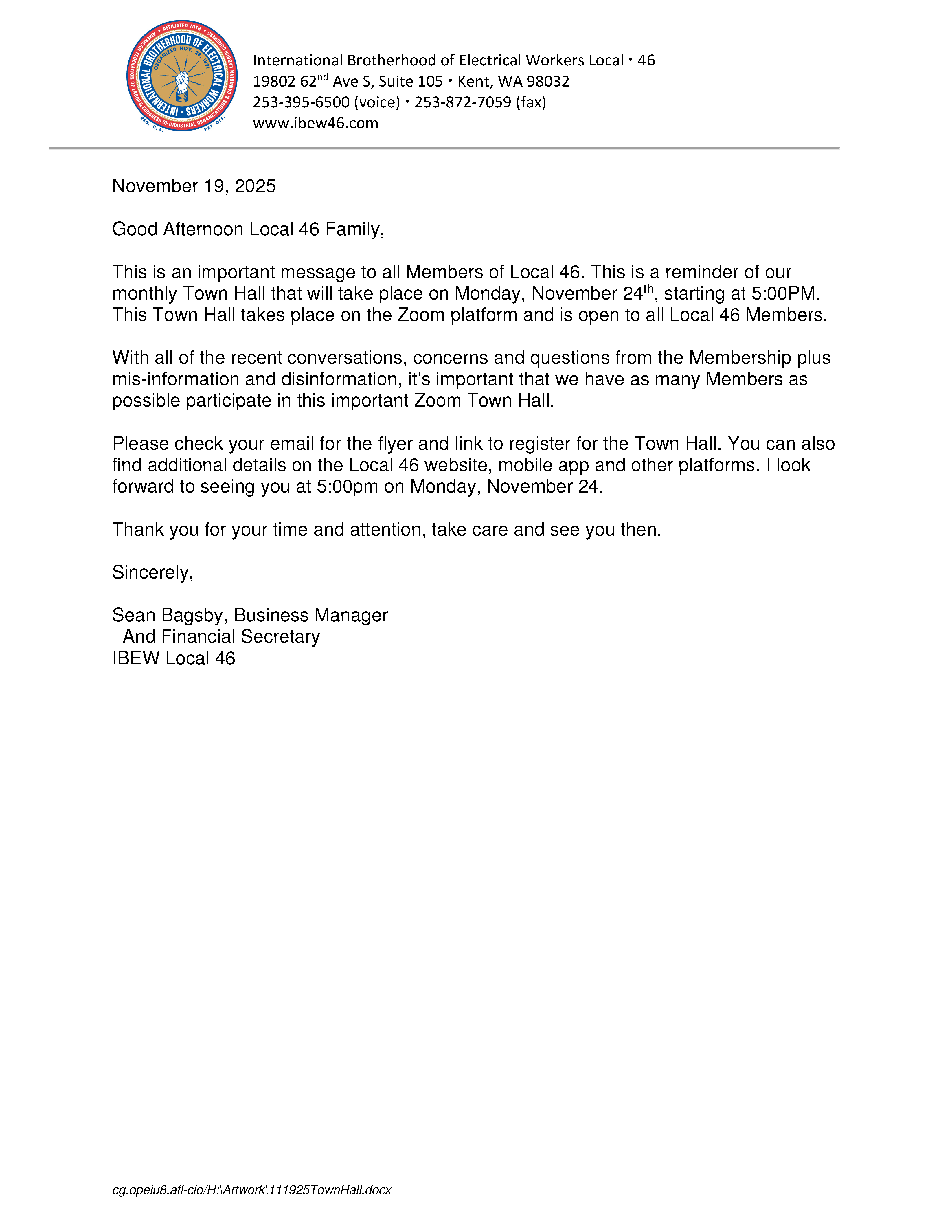 -IBEW LOCAL 46 ZOOM TOWN HALL PRESENTATION (VIA ZOOM)-