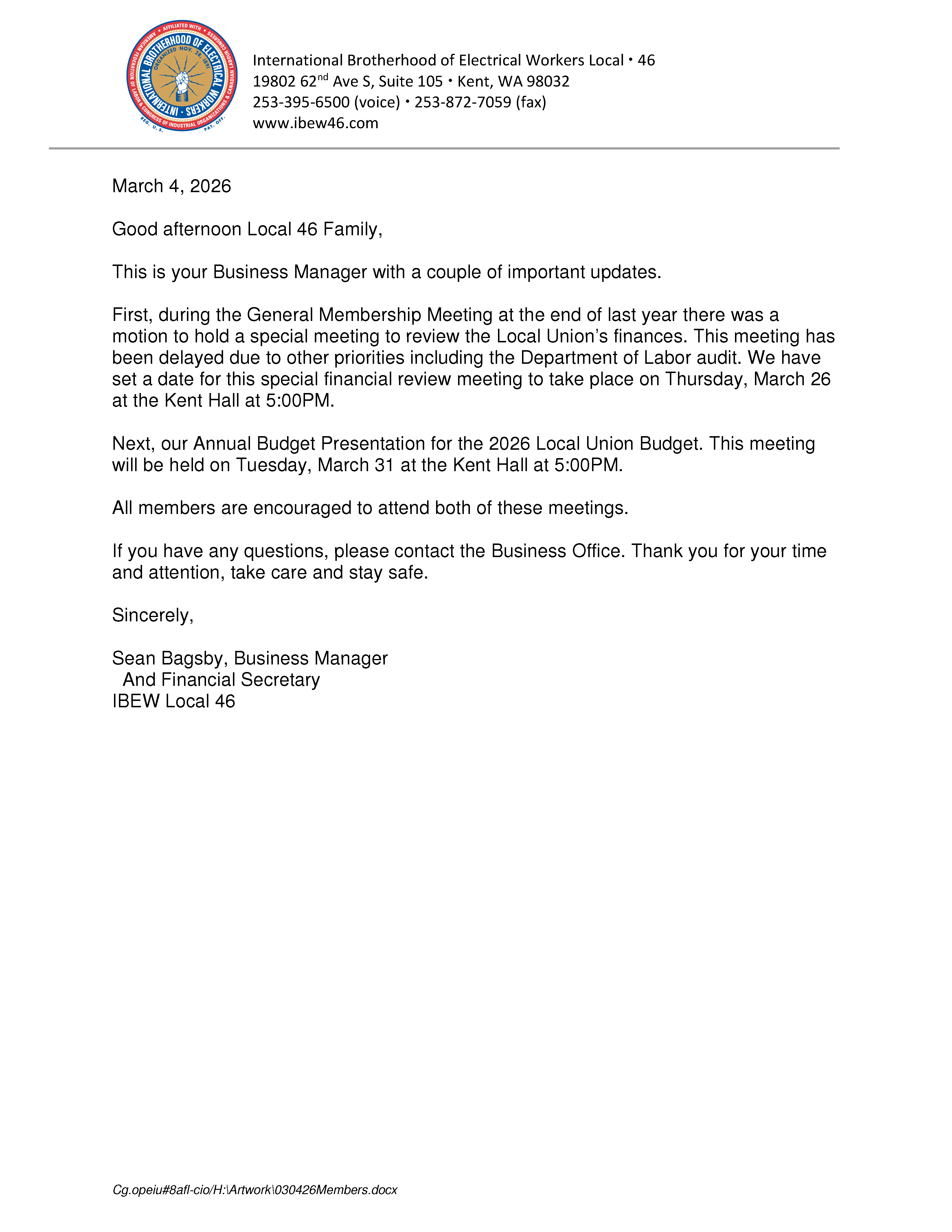 For more info, please contact Chapter President ANTONIO BUTLER "TONY": ANTONIO@IBEW46.COM or 253-395-6508.