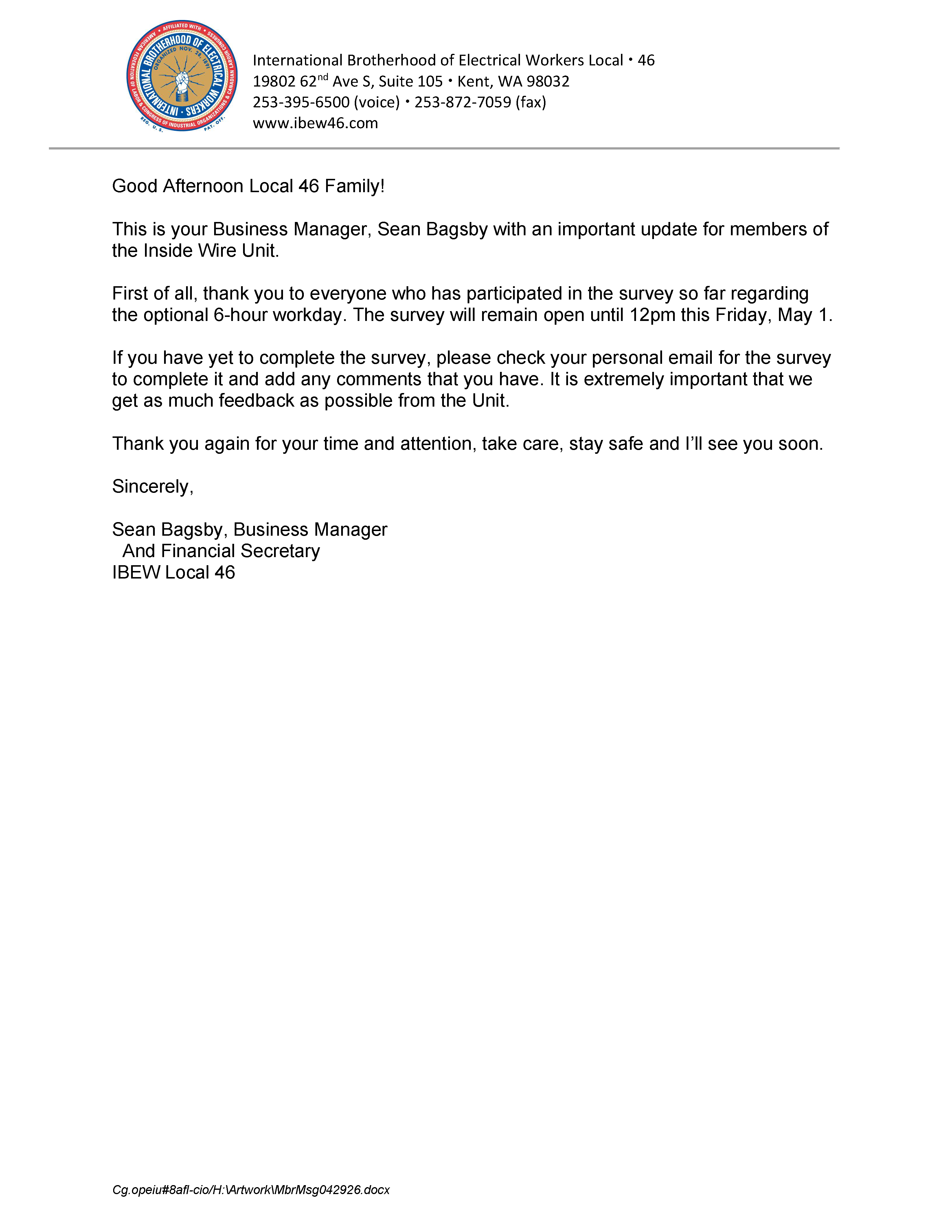 For more info, please contact Chapter President ANTONIO BUTLER "TONY": ANTONIO@IBEW46.COM or 253-395-6508.