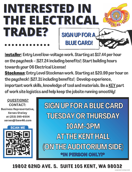 Interested in becoming an Electrician? Get started by joining PSEJATC's (Puget Sound Electrical Joint Apprenticeship and Training Committee) Apprenticeship program. IBEW Local 46 cosponsors PSEJATC to provide training for Apprentices and Journey Level electricians in the organized electrical industry within the IBEW Local 46 jurisdiction which includes King, Kitsap, Jefferson, and Clallam counties.