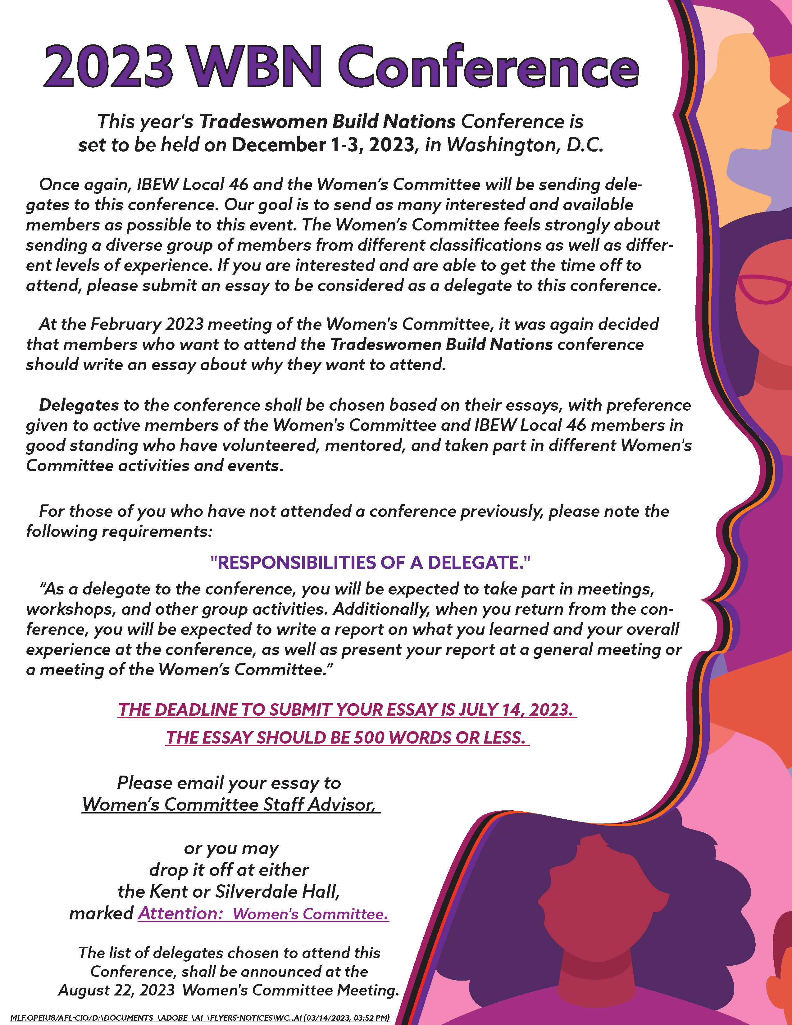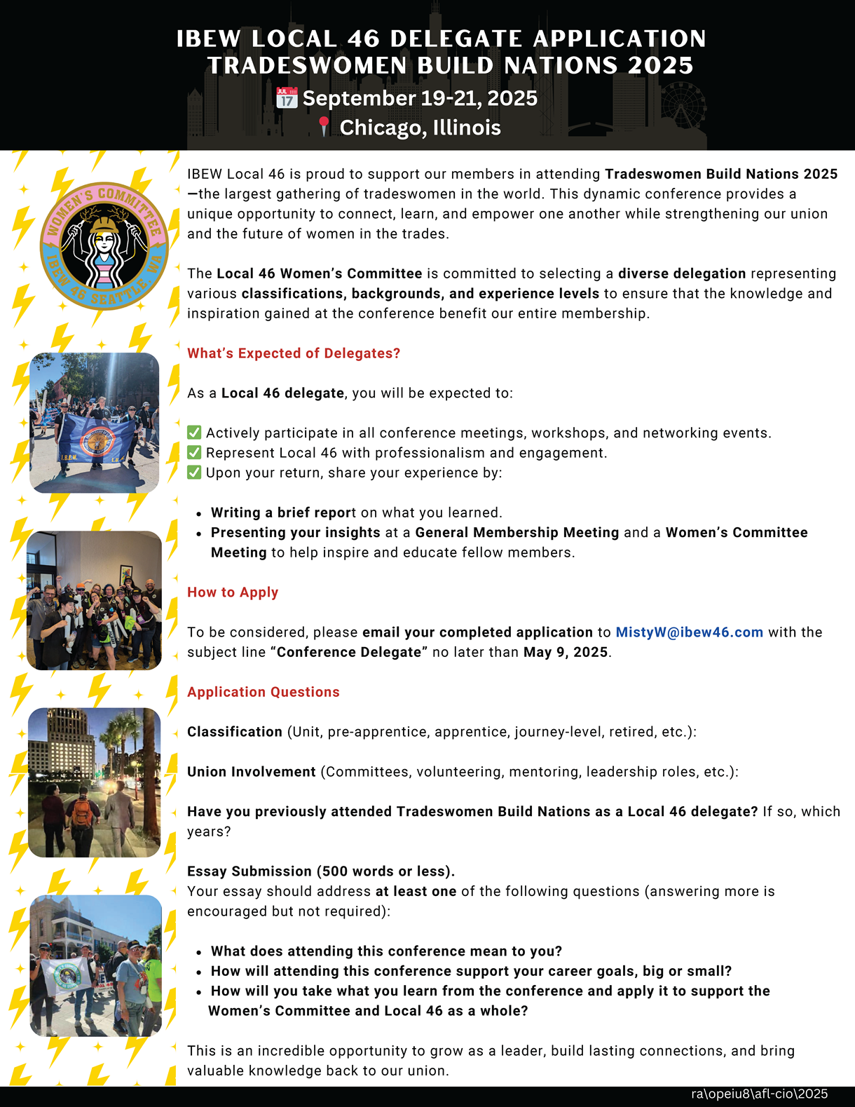 Delegates to the Conference will be selected based on their essays, with preference given to active members of the Women’s Committee, as well as IBEW Local 46 members in good standing who have volunteered, mentored, and participated in various Women’s Committee activities and events.